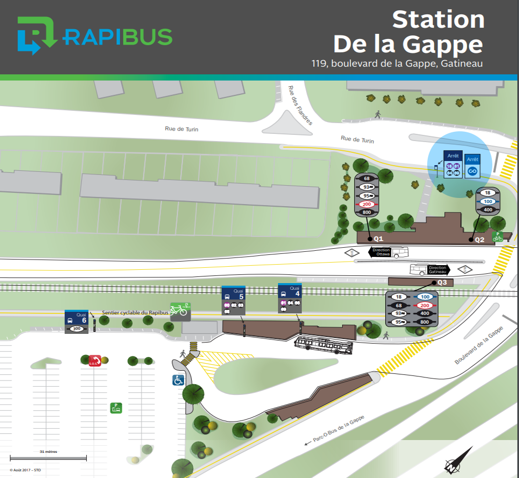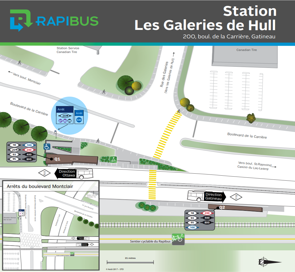 The Transcollines stop is on the same side of the street as the STO’s Rapibus, but Transcollines buses do not travel on the Rapibus corridors. The user must wait at the stop located on de la Carrière Boulevard, in front of the gas station, but on the other side of the street. The user must make sure to see the blue and white Transcollines stop sign 921-923-924-925 and 932.