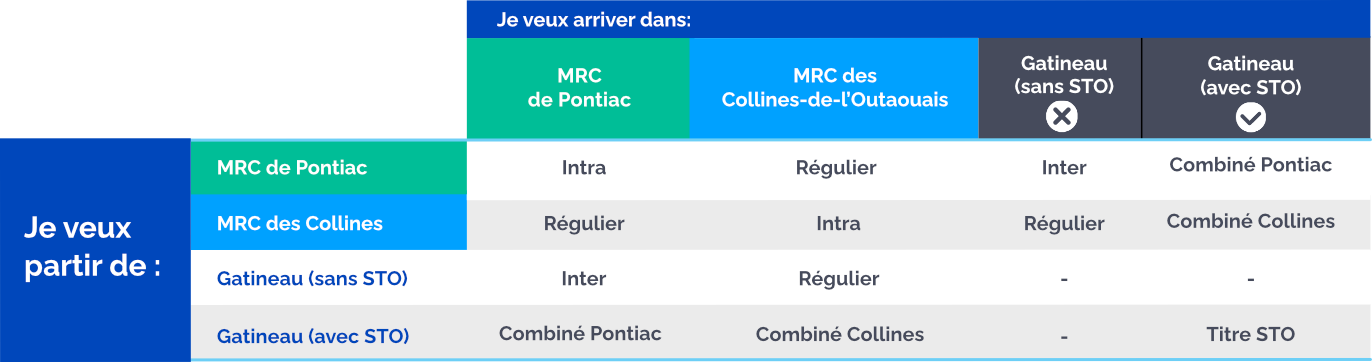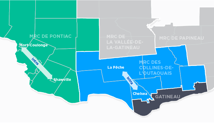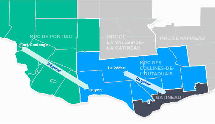 Public transportation This content is intended for the public covered by the exceptions of the Charter of the French language and its regulations. If you read on, you confirm that you fall within one of these exceptions. Plan your commute Plan your commute by clicking on a route to consult the detailed interactive map and the schedule for each stop. 2023-2024 Service An optimized fixed line service is in effect since May 15th., 2023. The less used 922, 924 (evening), 933, 934, 941, 943 and 994 lines were withdrawn and are replaced by on-demand service. The popular 925 line now has a second AM and PM passage. Get all the details here Schedules and routes 910Pontiac — Gatineau 921La Pêche — Chelsea — Gatineau 923La Pêche — Chelsea — Gatineau 924La Pêche — Chelsea — Gatineau 925La Pêche — Chelsea — Gatineau 931Cantley — Gatineau 932Cantley — Gatineau 940Val-des-Monts — Gatineau Maps | Schedules Check out the maps and schedules of our routes in printable format (PDF) Services offered on weekends and Holidays On weekends, route 924 operate according to the weekend schedule. All other lines are not in service. We invite users to use the On demand service. On public holidays, fixed-route are not in service. We invite users to use the On demand service. Public holidays are: New Year’s Day • Good Friday • Easter Monday • National Patriots Day • Saint-Jean-Baptiste Day • Canada Day • Labour Day • Thanksgiving • Christmas. Titles and fares 2025 fares | Public transportation and on demand service (TOD) Monthly pass Intra** Regular Combined STO Collines Inter Pontiac Combined STO Pontiac Basic $95.00 $120.50 $133.00 $175.25 $280.50 Student $65.00 $82.50 $95.00 $134.50 $198.75 Seniors $42.00 $53.00 $65.50 $99.50 $140.25 The combined STO title allows you to make a transfer with the services of the STO. | To validate your pass, present it to the driver along with your proof of payment when you board a Transcollines vehicle. | ** Please note that intra passes are only available at our service point with an appointment. One-way pass Intra Regular Combined STO Collines Inter Pontiac Combined STO Pontiac (Direction Gatineau) (Direction Gatineau) Basic $5.00 $5.00 $7.00 $20.00 $22.00 Student $5.00 $5.00 $7.00 $20.00 $22.00 Seniors $5.00 $5.00 $7.00 $20.00 $22.00 The combined STO title includes a transfer ticket for STO services. Transfer Combined STO Collines Combined STO Pontiac (Direction Collines) (Direction Pontiac) STO transfer + $2.00$ STO transfer + $17.00$ The regular 2025 fare for a single passage with the STO is $4.50. When paying in cash, the user must make sure to have the exact amount since no change is given on board taxis and buses. | Rates subject to change. | This price chart only applies to public transit and on demand service. For the prices of other service components, please visit the sections “Paratransit” and “Rural public transport.” | Free for children 5 (five) years old and younger accompanied by a fare-paying adult. Maximum of 3 (three) children per adult. | * See the titles descriptions below. Pass validation in Transcollines vehicles To validate your pass, present it to the driver along with your proof of payment when you board a Transcollines vehicle. Please note that the driver has the authority to refuse boarding if the passenger cannot present a valid ticket and is unable to pay with cash. Service types Intra Provides access to Transcollines services located within the administrative boundaries of one MRC. Regular Provides access to the territory of one MRC and one neighbouring MRC with no access to STO or OC Transpo services. Inter Provides access to the entire public transit network operated by Transcollines from the MRC Pontiac to Gatineau city and vice-versa, without having access to STO or OC Transpo services. With this pass, the user will be able to travel on 3 different territories, i.e. the MRC Pontiac, the MRC Collines and the territory of Gatineau or the other way around. Combined Provides access to the entire Transcollines public transit network operated by Transcollines as well as the STO and OC Transpo systems. Two types of Combined passes are available: Combined Collines for any trip to or from the MRC des Collines including access to Transcollines, STO and OC Transpo services. Combined Pontiac is for any trip to or from the Pontiac MRC, including access to Transcollines, STO and OC Transpo services. Sorry, this content is only available in French for the moment. User categories Basic : Regular user from 6 to 64 years old with no access to the student category. Student : The user must be a student and under 21 years of age on September 1st of the year the card is issued. Proof of age and proof of registration will be required when purchasing a smart card. Please note that the student status must be renewed every September; therefore, a new student smart card must be purchased each year. Seniors : The user must be 65 years or older and provide us with proof of age. Types of passes Monthly pass : Gives you access to an unlimited number of trips during a one-month period. To purchase a monthly pass, you must visit one of our service locations. One-Way Passage : Provides access to a single passage, one-way from embarking to disembarking. Passage fees are payable in cash only when boarding. Examples of Intra trips: A trip from La Pêche to Chelsea or the other way around (travel within the MRC des Collines) A trip from Fort-Coulonge to Shawville or the other way around (travel within the MRC Pontiac) Examples for Regular trips: A trip from La Pêche to Gatineau or the other way around (travel from the MRC des Collines + an adjoining area) A trip from Fort-Coulonge to Quyon or the other way around (travel from MRC Pontiac + MRC des Collines) Example for Inter trips : A trip from Bryson to Cégep Gabrielle-Roy in Gatineau or the other way around (travel from the MRC Pontiac + MRC des Collines + Gatineau Territory) E